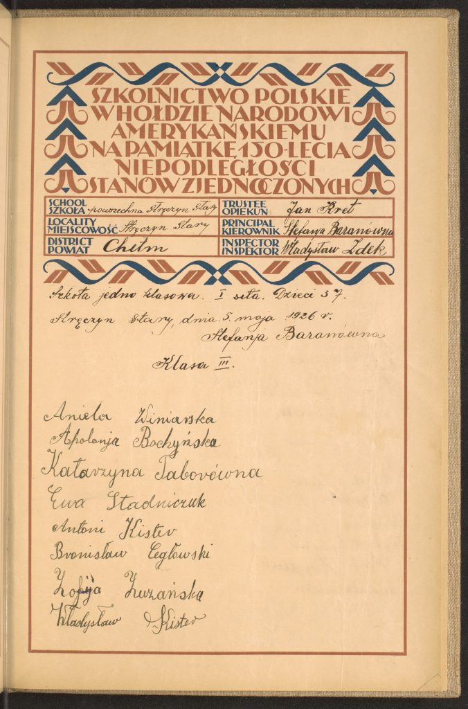 У 1926 році на території Польщі було організовано велику акцію зі збирання підписів із побажаннями на честь американського народу з нагоди 150-річчя незалежності Сполучених Штатів. У події взяли участь польські школи, на спеціально підготовлених аркушах учителі та діти залишили свої підписи, які сьогодні є надзвичайно цінним джерелом відомостей про шкільні спільноти того періоду.